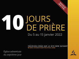 Cette année, nous vous invitons à rechercher le réveil et la réforme par la puissance du Saint-Esprit pendant les Dix jours de prière. Alors que vous priez à partir du message des trois anges, puissent-ils briller d’une nouvelle pertinence et vous conduise, vous et votre groupe de prière, à une expérience plus profonde avec Jésus.